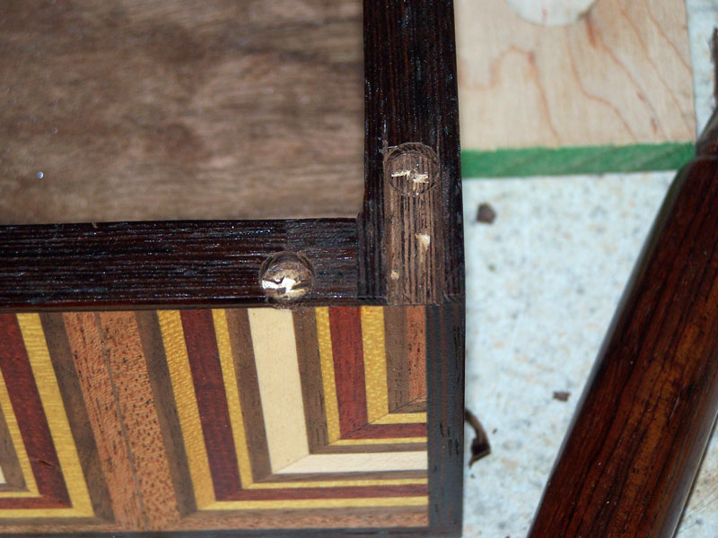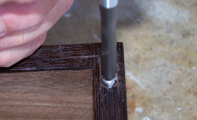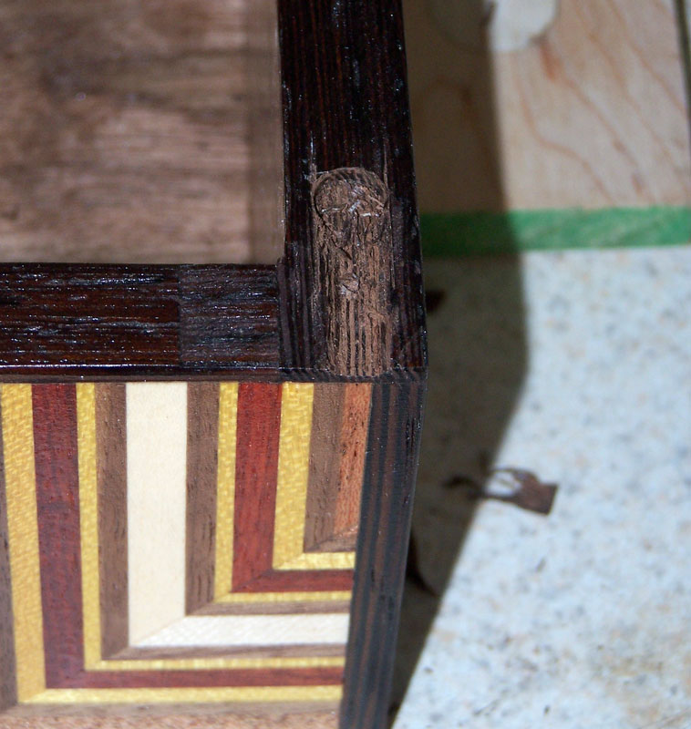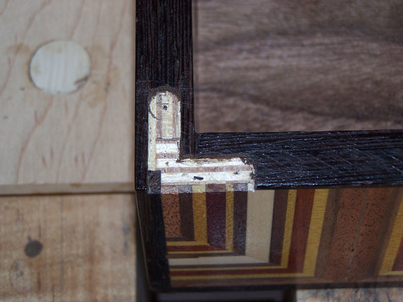 I next take the box to my workbench and use chisels to cut out the mortise for that leg of the wing. Since the wood is wenge, I need to be very careful to keep from breaking out the sides. I use my 1/8" chisel to excavate the center of of the mortise before I trim the sides with a 1/4" chisel. When I cut downward with the 1/4" chisel, the wood breaks to the center rather than to the sides.