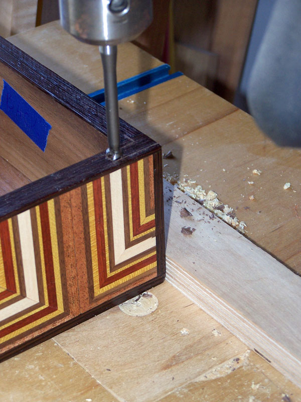 Note that I've placed a "stop" on my drill press table so that I can position (front to back) where the hole is drilled. I'll use this stop for drilling the front of the mortise in the other three wings (other side of the bottom and the two mortises in the top).
