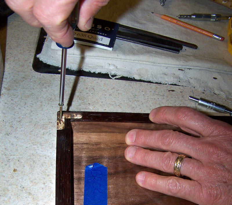 The screws supplied with the hinges are brass, and brass screws break off more easily than steel screws. To avoid the possibility of having one break off, I use a steel screw of the same size and screw it in and out before using the brass screws. If you've ever had to try to take out a screw that broke off, you'll understand why I'm so careful about putting in these brass screws.