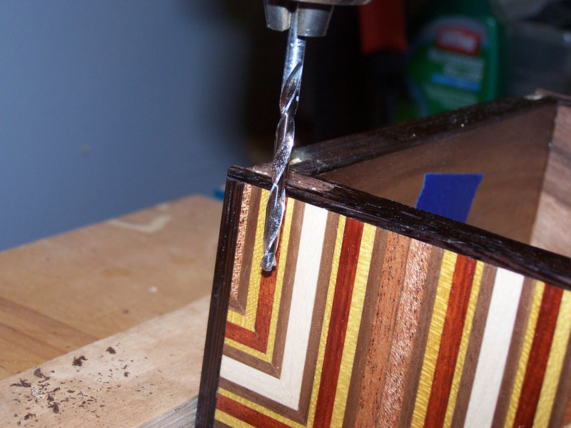 Put it in the drill press and set the depth to about 3/4" to 1". The top on this box is fairly high so I can use a fairly deep mortise in it. Use the marks you made for the location of the slots in the wings as a guide for drilling out the mortises.