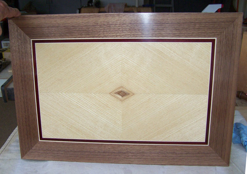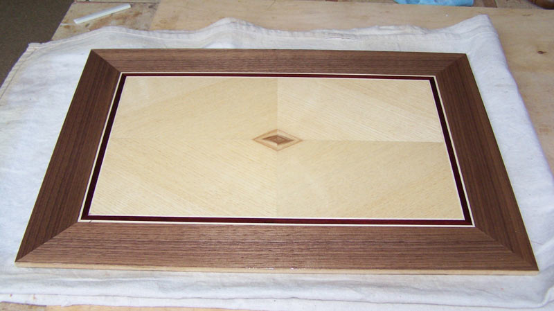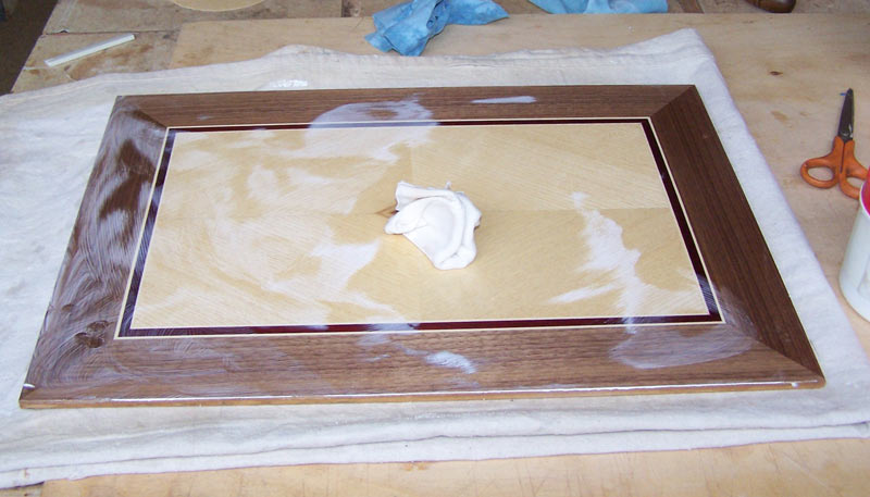 I start with the back side because once I finish with the front, I don't want to do any more work on the panel that might mess up the finish. I give the panel a light sanding with P220 sandpaper in my ROS, wipe the surface off well, and then shoot a coat of lacquer. When the lacquer is good and dry (hardened), I'll sand it again and shoot a second coat. I may, or may not, put a third coat on the back - it just depends on what the second coat looks like.