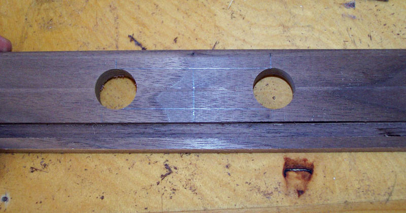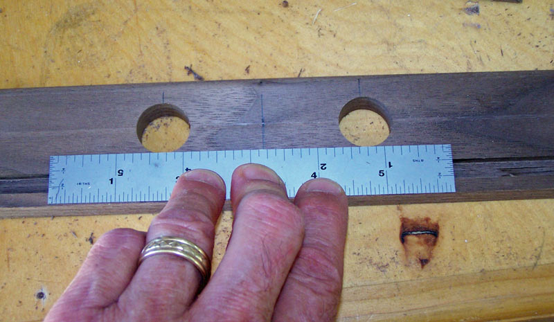 First, I find the approximate center of the handle piece and mark it. I'm using a center finding rule which makes finding the center easy. I use a small combination square to make the location across the piece.