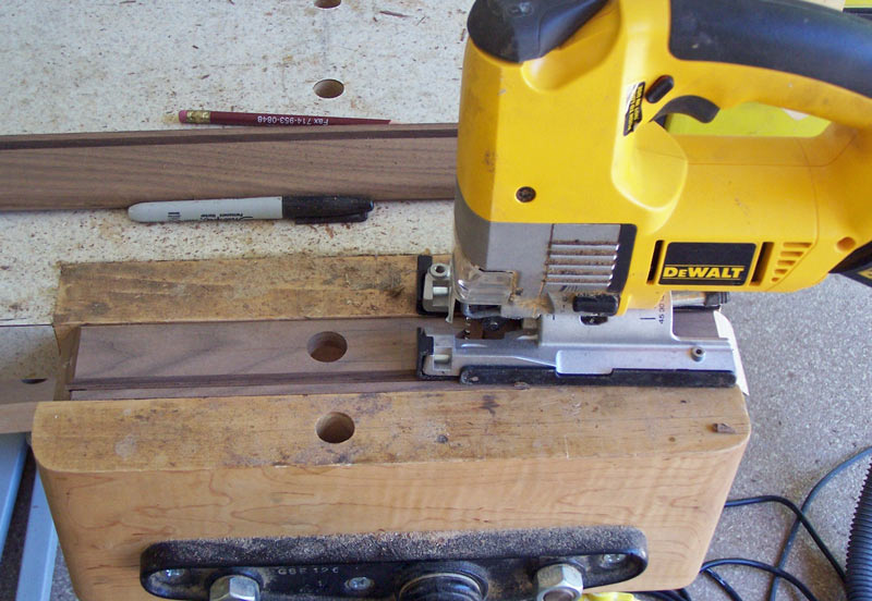 Clamp your piece in a vise and use a jig saw to cut along the lines. When you make this cut, be very careful when you finish the cut. You don't want to overrun the cut and cut into the side of the hole.