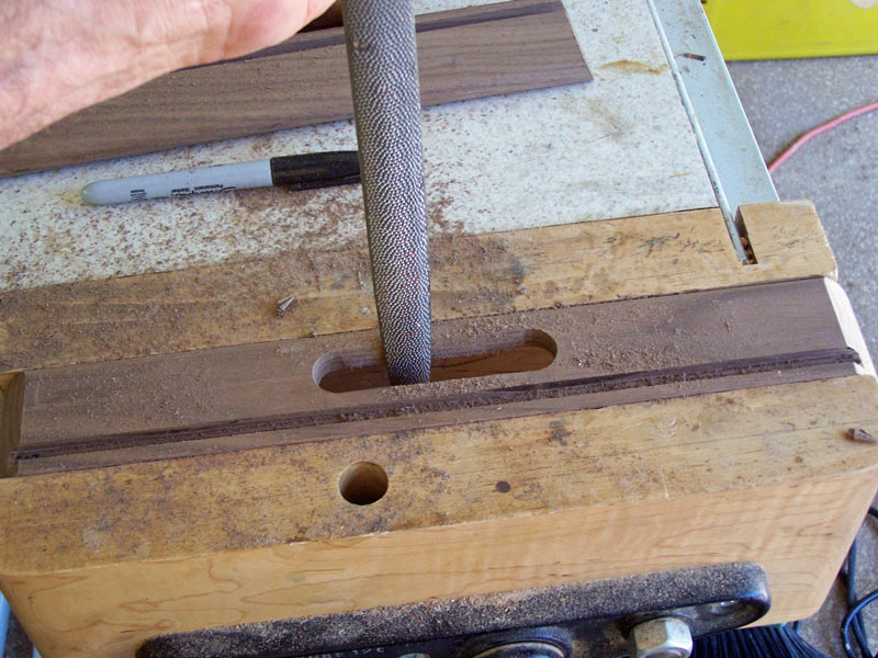 After making both cuts, clean them up with a rasp. Here I'm using a Nicholson #49 or #50 rasp. The resulting slot should be straight but it doesn't have to be really smooth.