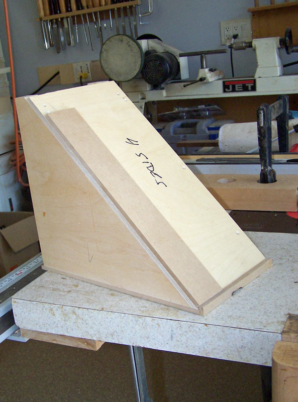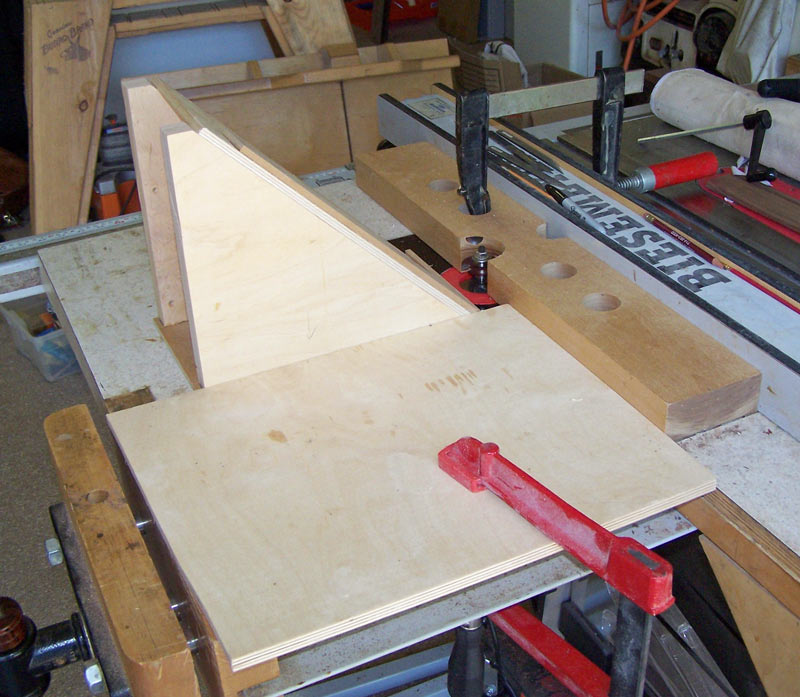 Note that I have a fence on the side of the jig. Because of the direction of spin of the slot cutter, the wood will be pushed into that fence as the cut is made. Note, also, the "stop" at the bottom of the jig. This will register each piece so that the cut is made in the same place on each board.