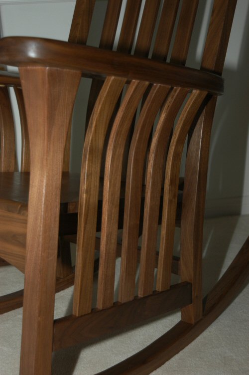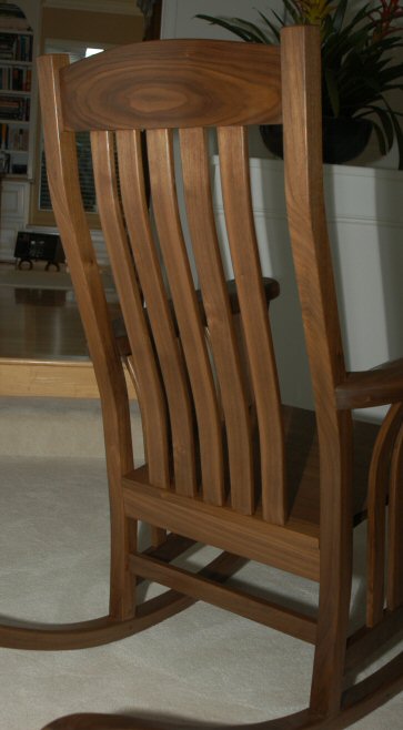 Much of their other furniture is in the craftsman style so they asked me to build the rocker in that style. I’m not a big fan of the craftsman style so I went searching for something that would fit with their other furniture but would not be strictly craftsman. It’s based on an original by Jay Speetjens that I saw in a 1995 issue of Woodwork. All I had was a picture to work from – there were no plans or details in the magazine. The thing I liked about the design is that it has a “craftsman” flavor without being completely rectilinear. I especially liked the curved side slats – the side slats say “craftsman” but the curves give it a more modern look.