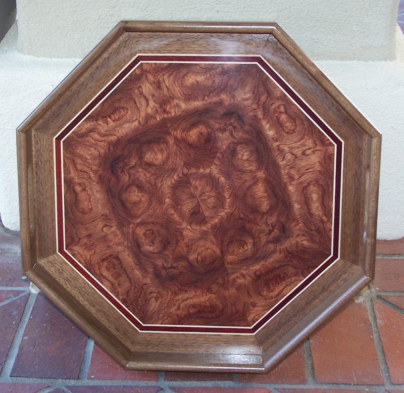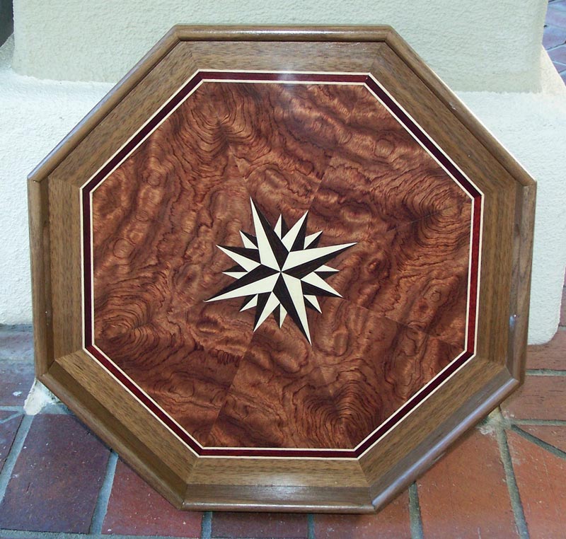 The trays can also be done six sided. Here's an example of a six sided tray with a bubinga field, bloodwood filetti and walnut border and sides. The eight sided tray allows a more interesting pattern to the bubinga because there are more pieces to the sunburst, but when a compass rose is inlaid, the six sided tray allows the compass rose to be aligned with the two "outside" corners and the hand holds.