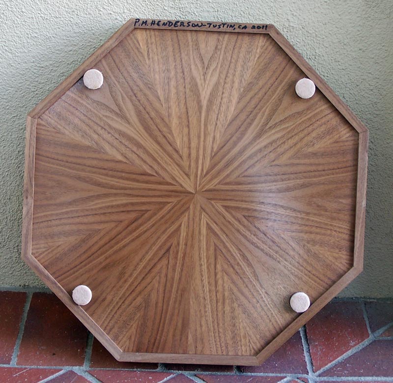 This first is an eight sided tray with a compass rose inlaid in the center. The compass rose is holly (light wood) and wenge (dark wood). The field is waterfall bubinga. Every selection of bubinga is different so this sample should be taken as representative. The filetti (trim) is bloodwood (red) bordered with holly (white strips). The border is walnut, and the sides are walnut. The back is done in walnut veneer laid in a sixteen piece sunburst.