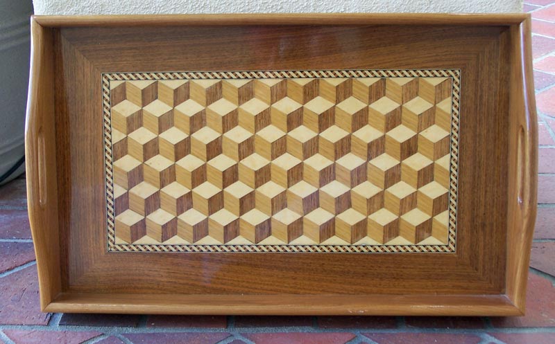 Here's a more complex pattern in a rectangular tray. The field pattern is known as "Louis cubes", named after king Louis XIV of France. The cubes are made of maple, walnut, and pecan (if I recall correctly). The banding is commercial and the border and sides are walnut. This tray is about 21 inches long and a bit over 13 inches wide.