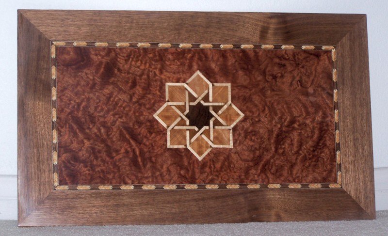 This panel uses a Celtic knot (with sand shading) as the centerpiece, a field of bubinga, commercial banding and a walnut border.