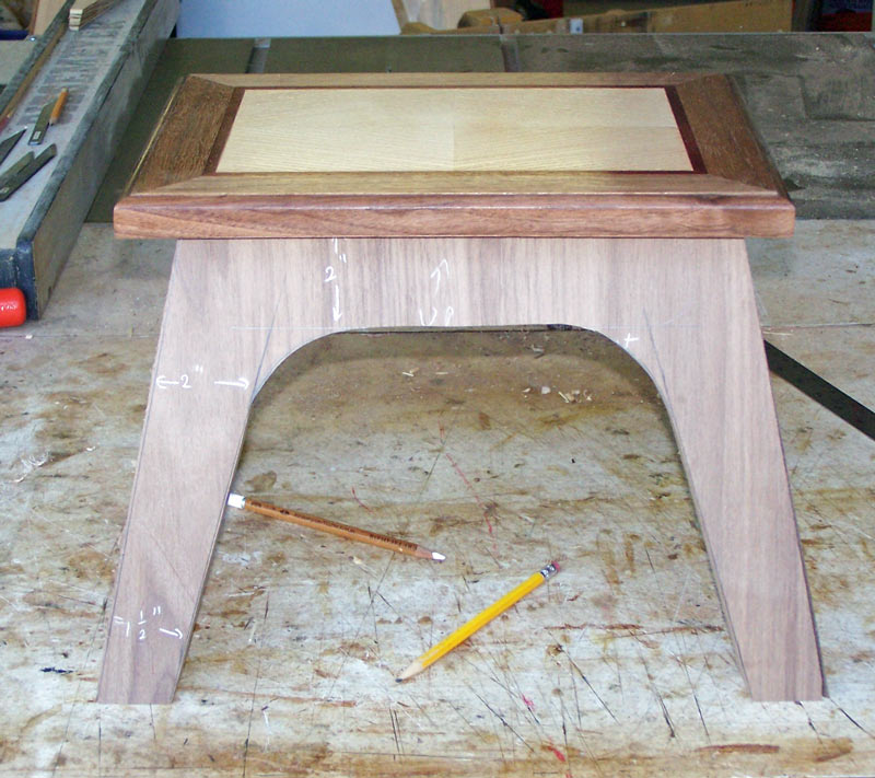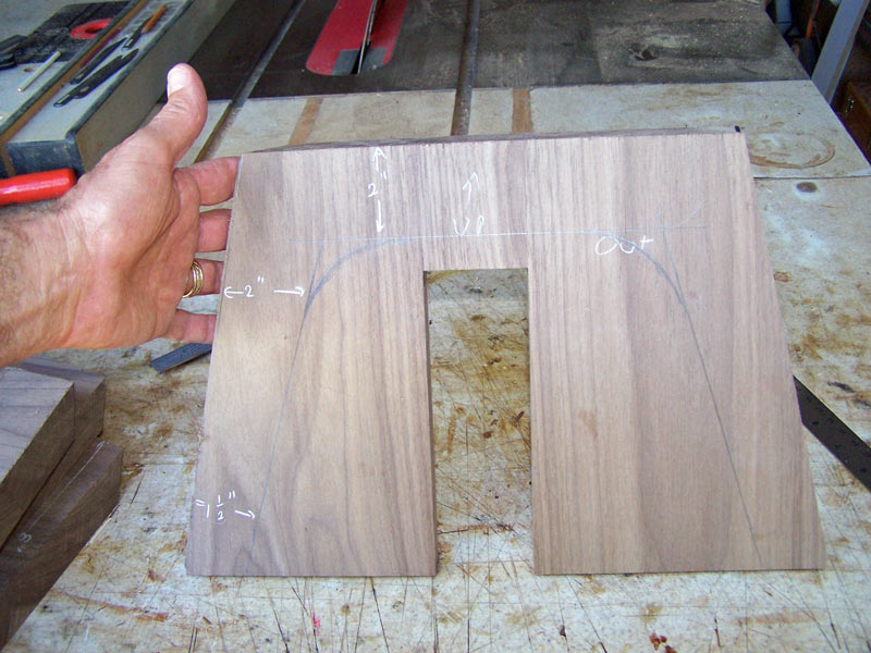 Now we're going to cut out the legs. Here's how I lay out the legs. I come in 1 1/2" at the bottom, and 2" along the top of the leg, and 2" down from the top. I sketch in the curve between the side and the top section by hand. Then I cut the legs out on my bandsaw.