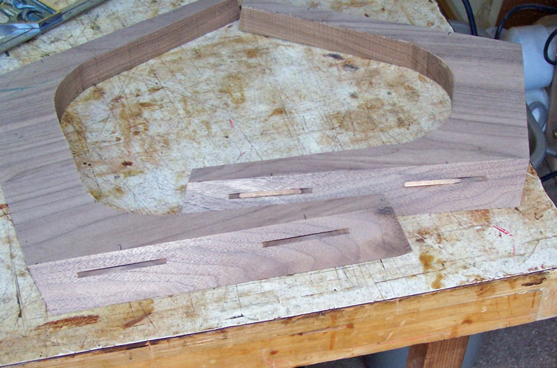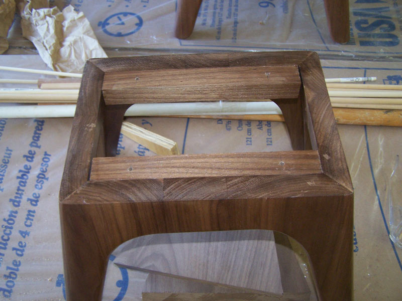 These get clamped to the front and back sides (inside). Screws will be put through them to attach the top to the base. You don't need a lot. The only stress will be when someone picks up the stool by the top. Since the pieces were cut with a 12* bevel, the top is flat.
