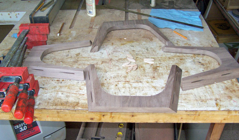 To make it easier to keep everything together during the glue up, I cut biscuit slots for #10 (not #20) biscuits in the side of each leg, 2" from the top and 2" from the bottom.