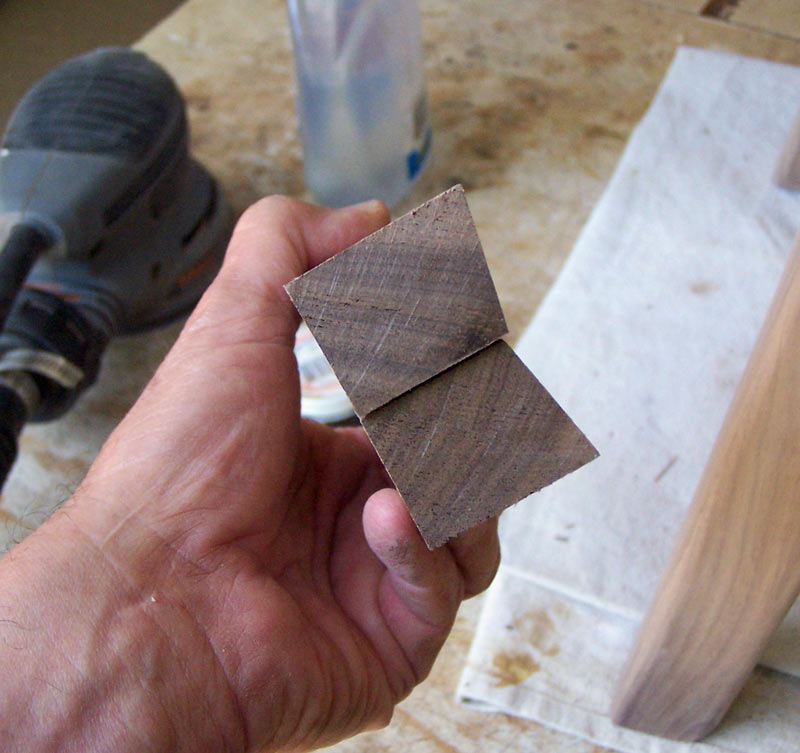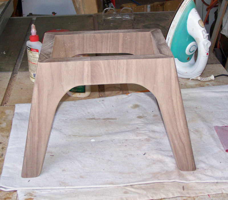 After the glue is good and set, take the base out of clamps and sand it to 220 grit. Note that I rounded the edges of the legs. The iron in the background is used to steam out dents.