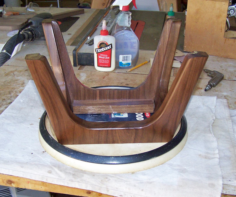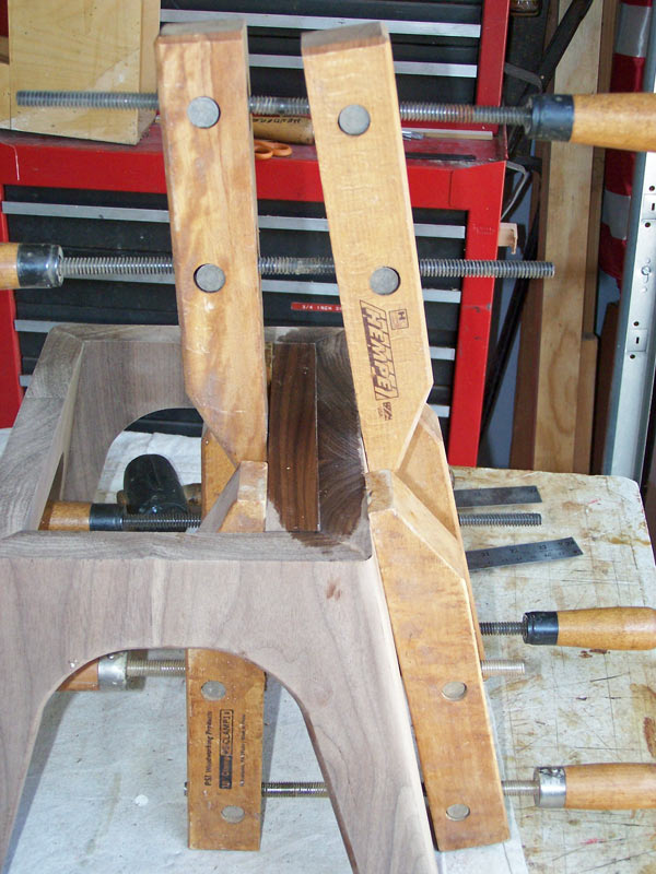 Gluing these pieces onto the front and back sides adds some strength to the base - the middle part of the legs is short grain and not as strong as the rest of the base. Another way to strengthen the base is to cut a groove in the bottom edge of the short grain portion and put a spline in. That's what I did on an earlier step stool I made.
