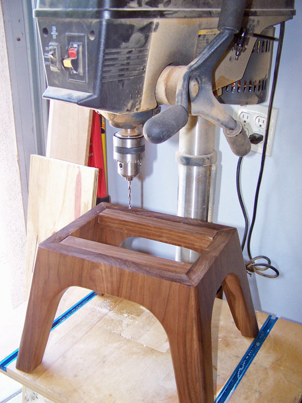 I could have done this earlier but I wanted to see what the base would look like finished. Now I need to drill four holes for the screws to attach the top to the base. I used my drill press.