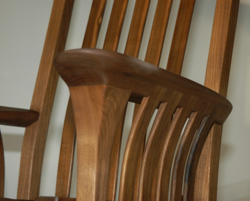 The major change from the traditional Craftsman ethic is the use of curves (Craftsman furniture is so rectilinear), especially in the side and back slats and the arms. I also added a sculpted seat and "build-ups" on the rockers where the legs meet the rockers. But it still has the "flavor" of an Arts and Crafts piece of furniture - I think anyone familiar with Arts and Crafts would identify this as a Craftsman piece of furniture upon first examination.