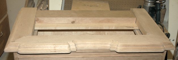 4/19/05 - I finished carving the base molding and am in the process of making the base frame. I haven't finished fitting the front piece to length yet. The back piece of the frame is Cherry - since I'm putting a nice cherry frame and panel back on the chest, I'm going to make the rear parts of cherry, also. Carving the molding wasn't as hard as I though it would be, even though this was my first attempt at carving. Next, I need to start on the legs. The front portion of the legs will require carving.
