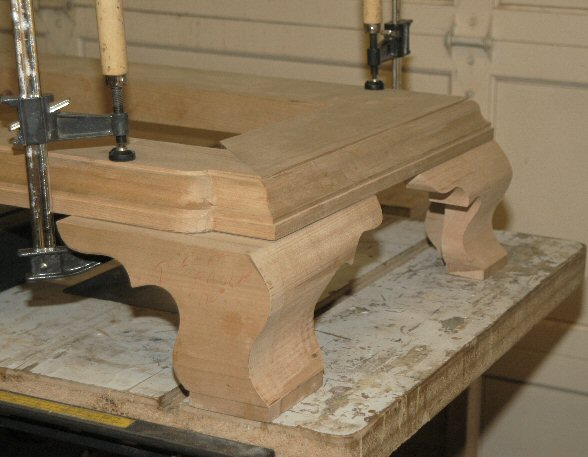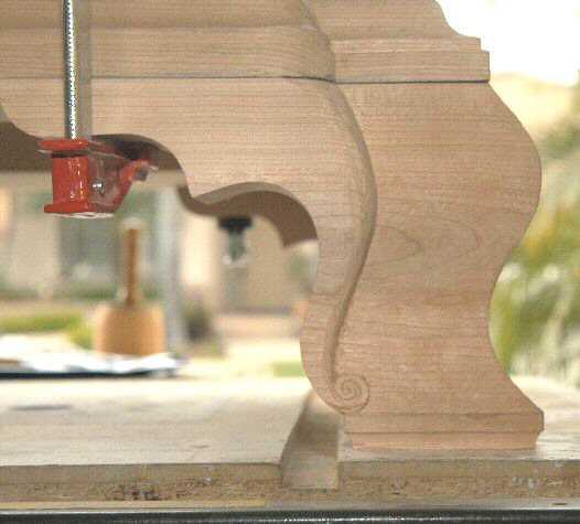 4/25/05 - I roughed out the carving on one front foot (see picture). Now, the problem is to do the second foot to match. It's much easier to carve only one of something because when you make a mistake, you just modify the carving to suit. But when you have to do two matching pieces, it's much tougher.