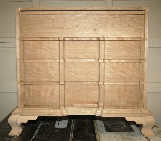 4/27/05 - I completed enough of the base to be able to sit the chest on it for a picture. I still have a lot of detail work to do make everything flow well, and I still need to sand the base and legs, but this is a real milestone! While I'm finishing the base, I'm going to start on the top, cutting the profile into the top. I made the ogee of the legs a bit more bold than the original Townsend chest so I may overlap the top a bit more and change the top molding just a bit to keep the same proportion as the legs. I still haven't done any fitting on the drawers so they're still too tight.