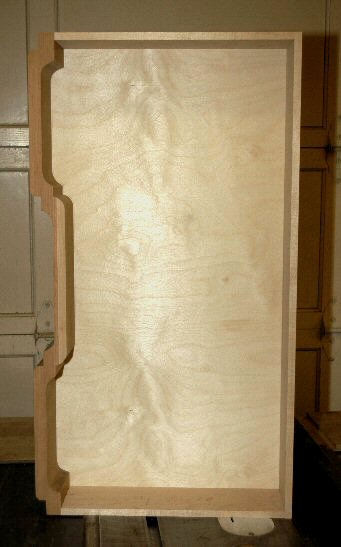4/13/05 - I completed the drawers today - the final work was to cut the groove for the bottom into the four sides of the drawer and to cut the bottoms to shape. Robert Thornbury suggested cutting the groove with the four sides of the drawer assembled and it worked great. Doing it that way (with the slot cutter) means that the groove is aligned around the four sides - there's no risk of having the grooves misaligned between two adjacent sides. I did have to clean up the corners with a chisel but that was fairly easy (although it took longer than cutting the rest of the grooves). Cutting the bottoms to shape was a bit tricky due to the shape of the drawer fronts, but it wasn't too hard to get the shape correct. I traced the inside shape of the drawer front and then added 1/4 inch for the groove. The cut was made on the bandsaw.