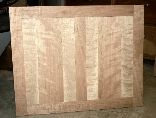 2/13/05 - I completed fabrication of the frame and panel back. The back has not been glued yet (nothings been glued yet, except the boards for the side and bottom). Note the curly Cherry - I found this in the "shorts" stack at the hardwood lumber yard - some of it has a lot of sapwood so it'll never patina like the heartwood but it really looked good for the price.