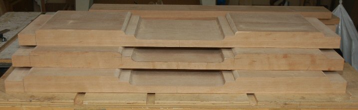 2/20/05 - I finished "roughing out" the blockfront drawer fronts today. They need to be trimmed to size, both in width and length, but I won't do that until I have the case assembled and can see exactly what size to trim them to. Next, I will use the drawer fronts as templates to mark the drawer dividers. I will use the profile of the drawer front and add 3/16 inch for the cockbeading.