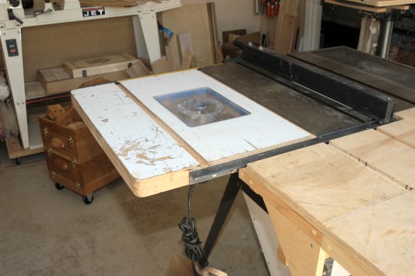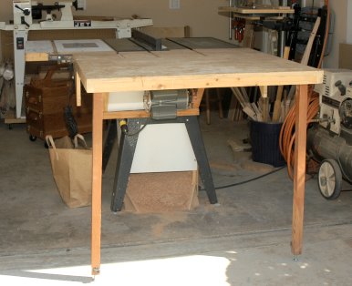 As I alluded to earlier, I also added a folding outfeed table to the saw (shown closed and open) and built a router table as one wing of the saw. Note the dust chute built into the bottom of the saw. Note also, that my shop is not one of those pristine dust-free and chip-free shops that are shown in Fine Woodworking.