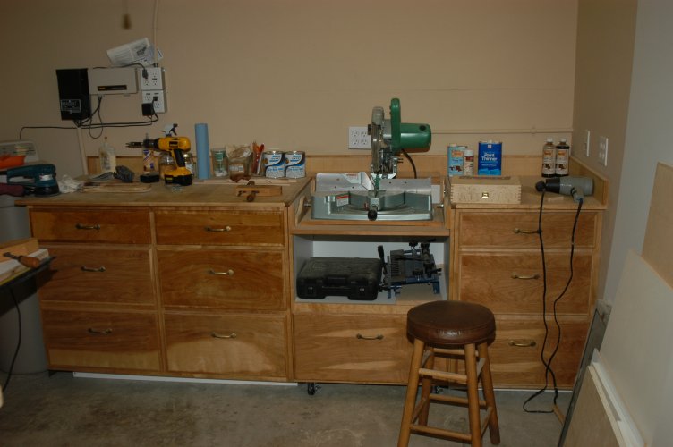I was able to get about 60% of one bay of a three car garage. I built walls because a shop creates a lot of dust and we wanted to keep dust off the cars. I put a 50 amp breaker in my main electrical box and installed a sub box at the shop with maybe a dozen circuits. I ran both 220 and 110 circuits in the shop - lots of 110 outlets - and put GFI on all the 110 circuits, including the lights. Next, I had to build some cabinetry for storage and to have some workspace. This is a picture of my first cabinet work. I built it out of melamine and birch plywood. I selected birch plywood with heartwood because I find regular birch boring. The miter saw is mounted on a rolling cabinet so that I can take it out of the shop for cutting long molding.